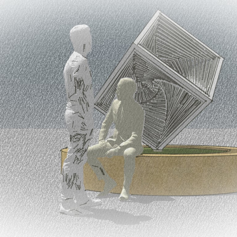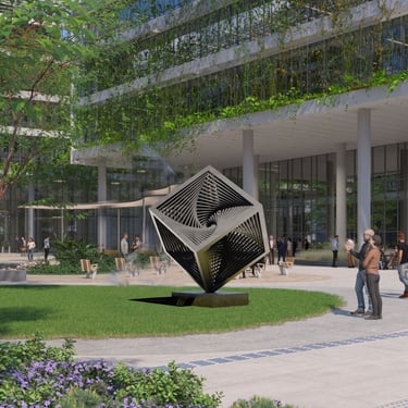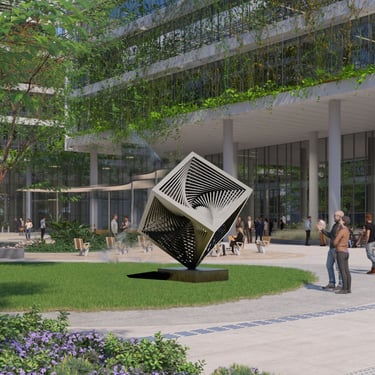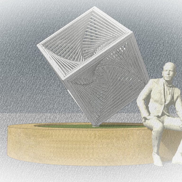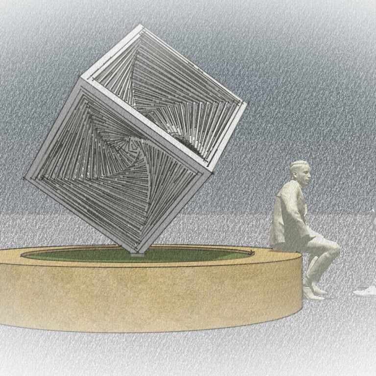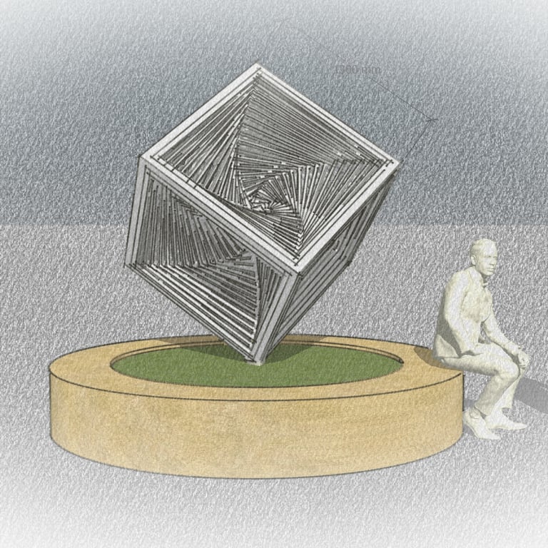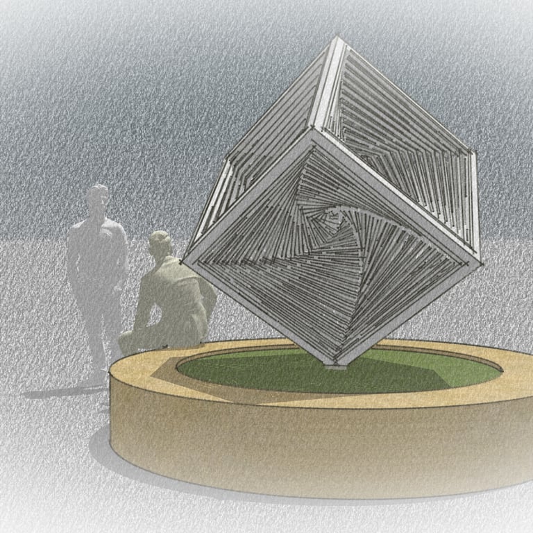 The sculpture "Synergy Cube" is a monumental work designed for a high-tech park. The sculpture is a cube, the sides of which are decorated with spiral elements. This shape, combining the cube's simplicity with the spiral's dynamics, symbolizes the essence of technological innovation: a continuous process of growth, improvement and constant progress.