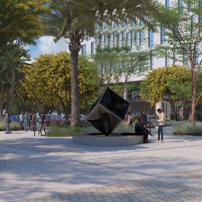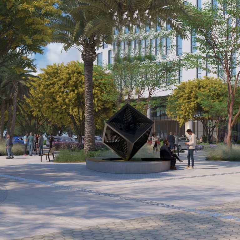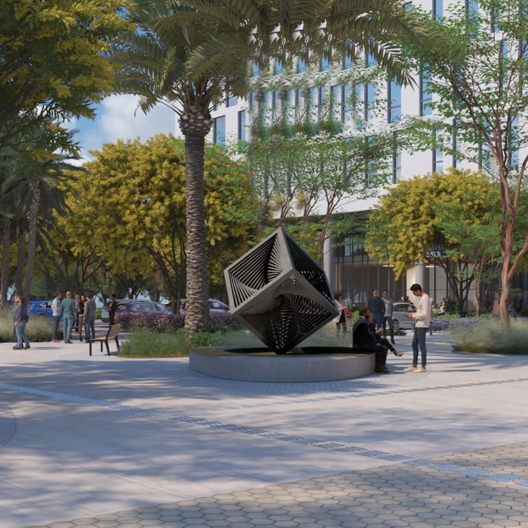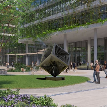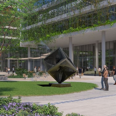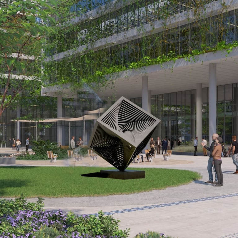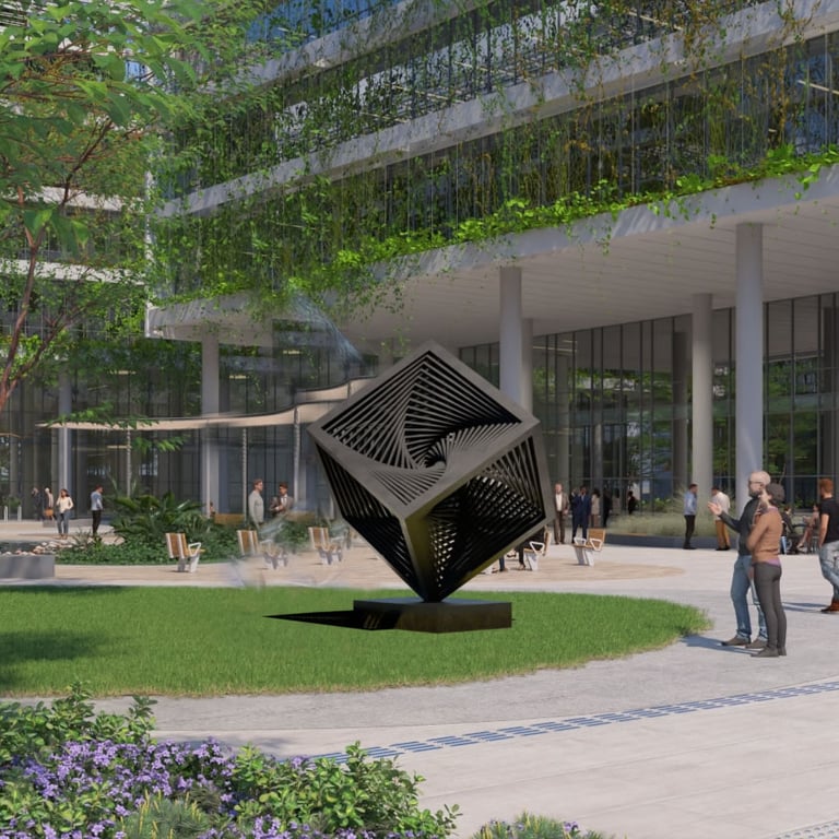 The sculpture "Synergy Cube" is a monumental work designed for a high-tech park. The sculpture is a cube, the sides of which are decorated with spiral elements. This shape, combining the cube's simplicity with the spiral's dynamics, symbolizes the essence of technological innovation: a continuous process of growth, improvement and constant progress.